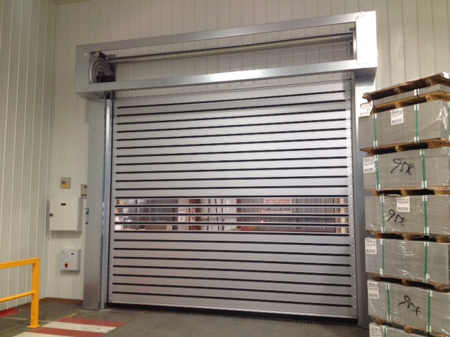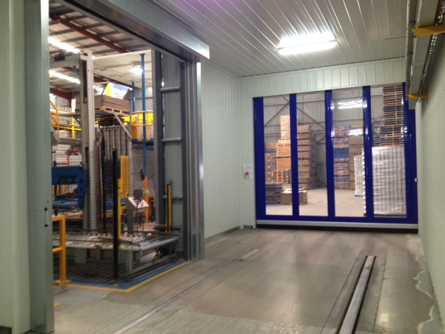 Key to the project was providing a solution to the entrance of a proposed airlock, which housed an automatic robotic pallet trolley that transferred all produced cans from production to warehousing. The pallet trolley ran on tracking guides in the floor, along with a side rail which passed through the opening and provided power and signal information to the trolley for automation. Along with these physical obstacles in the doorway itself, all finished pallets produced by the facility pass through this entrance meaning that a regular sliding type door would not be suitable due to the high cycle work load.