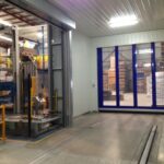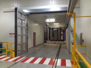 Through a design and consultation process with the customer, Premier Door Systems was able to provide a perfect solution via the EFAFLEX range of High Speed Doors and in particular the EFAFLEX SFT, High Speed Folding Door. In this application the SFT was designed as a single leaf folding door which had a recess that allowed the trolley arm to pass through the door when in the closed position, but also provided effective sealing important for quality control. The doors design also means that it does not require any guide rails, or recesses in the floor thus not interfering with the rail tracking. Direct configuration from the doors control to the automation of the trolley allowed for seamless integration into the process system, creating an effective airlock, form of activation and safety.