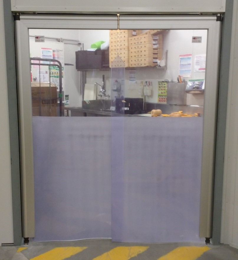 Our very own PVC swing door is equipped with see-through panels that absorb impact and allow hands-free operation.