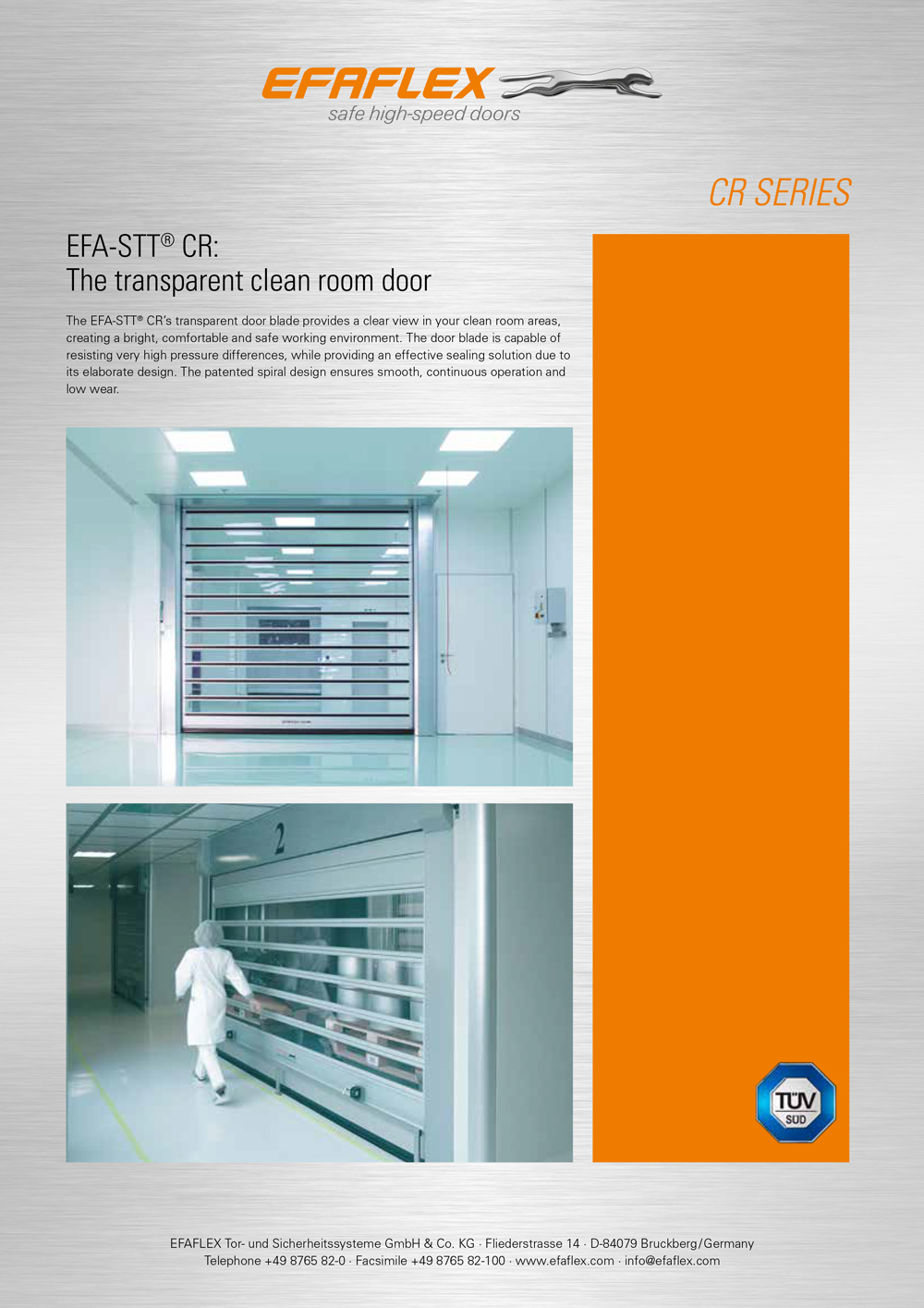 The clean room high-speed doors in the CR Series from EFAFLEX are perfectly adapted to the requirements of controlled clean rooms (GMP). Even with high pressure, air exchange is reduced to a minimum increasing the service life of air filters. The doors offer outstanding, hygienic design, clinical appearance, smooth surfaces and no protruding edges. This all enables the doors to be cleaned effortlessly and comfortably, and for particle deposits to be largely prevented. The wide range of options make it easy to select the right door for your specific clean room application, with certification up to ISO Class 5 available.